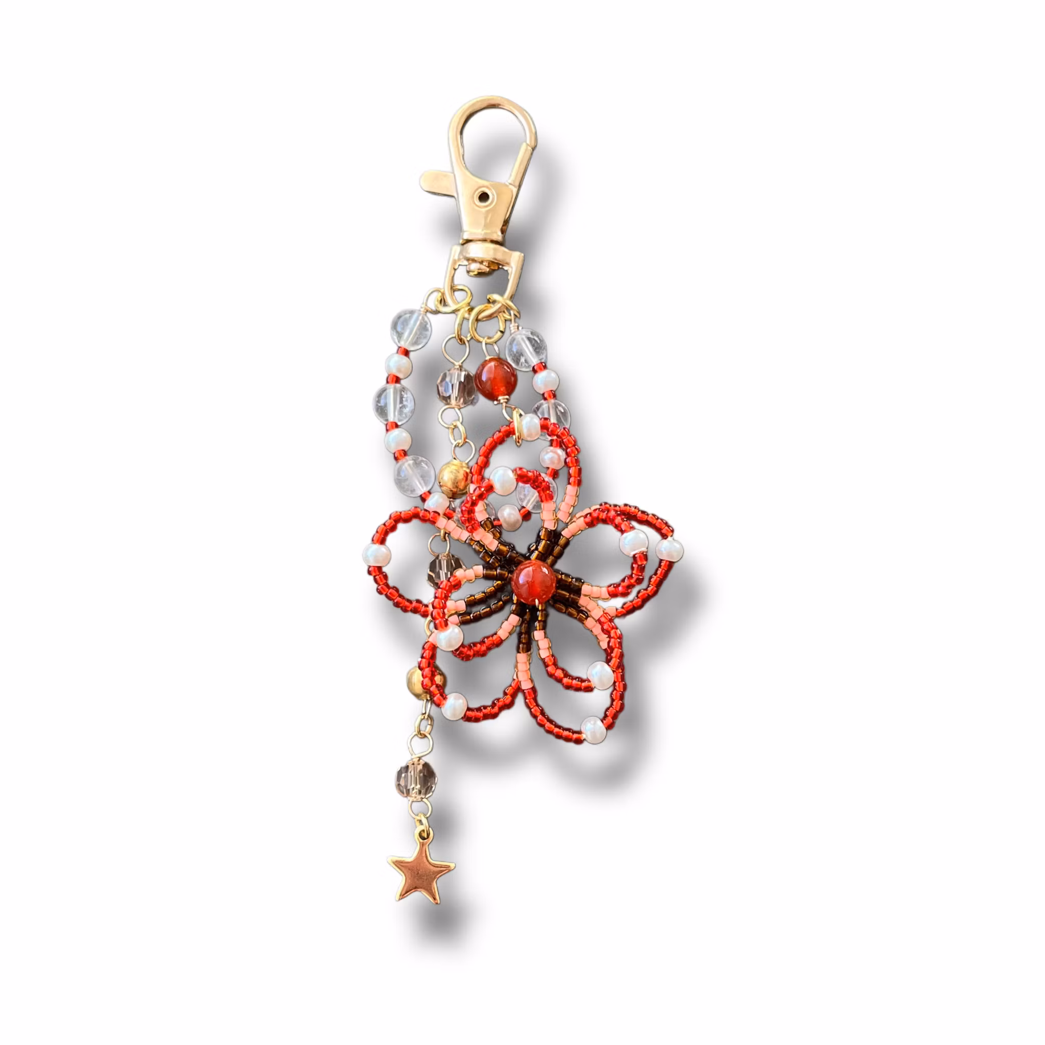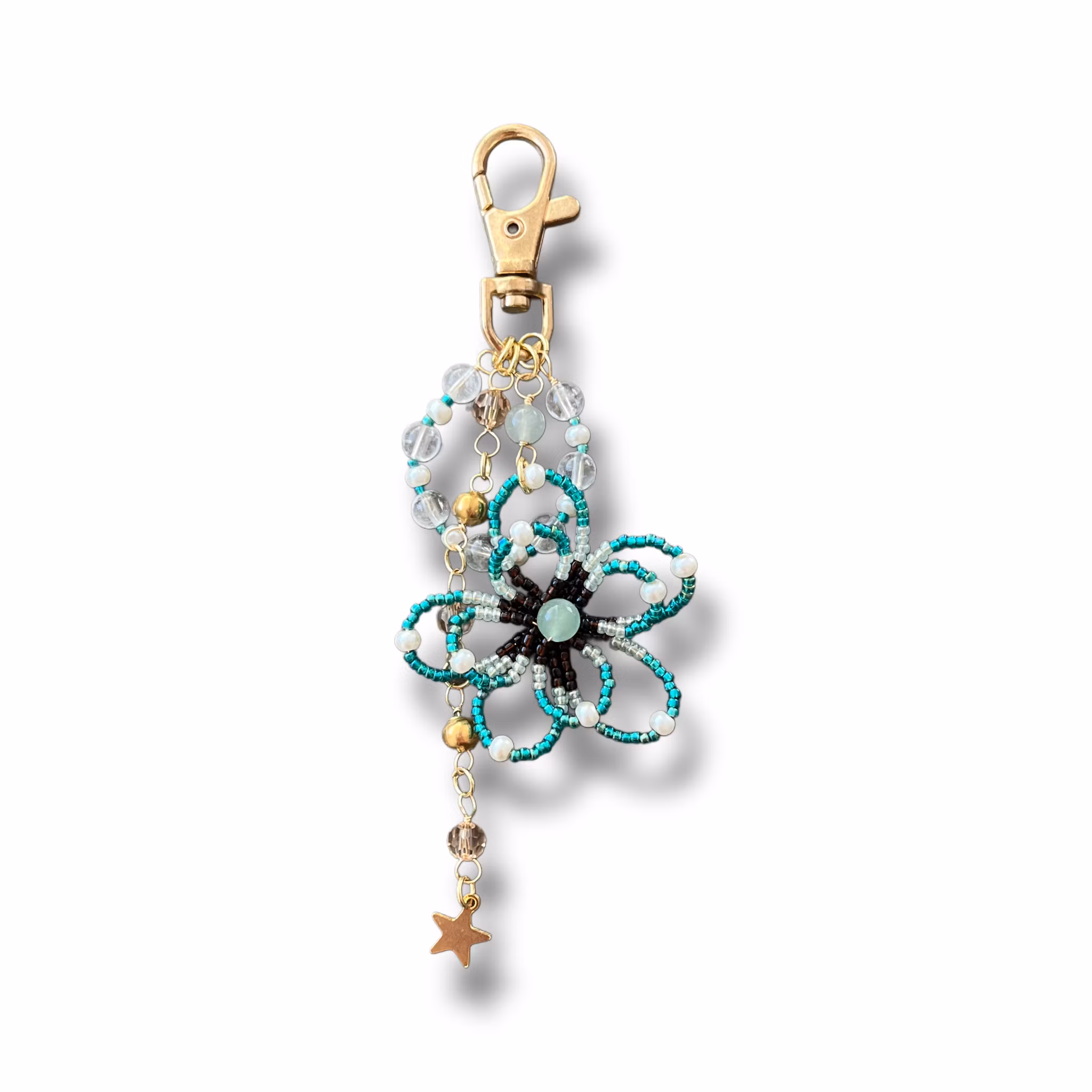 Berlocken är en handgjord blomma utav japanska miyuki pärlor. Nyckelringen är inte utav rostfri metall så undvik kontakt med vatten.