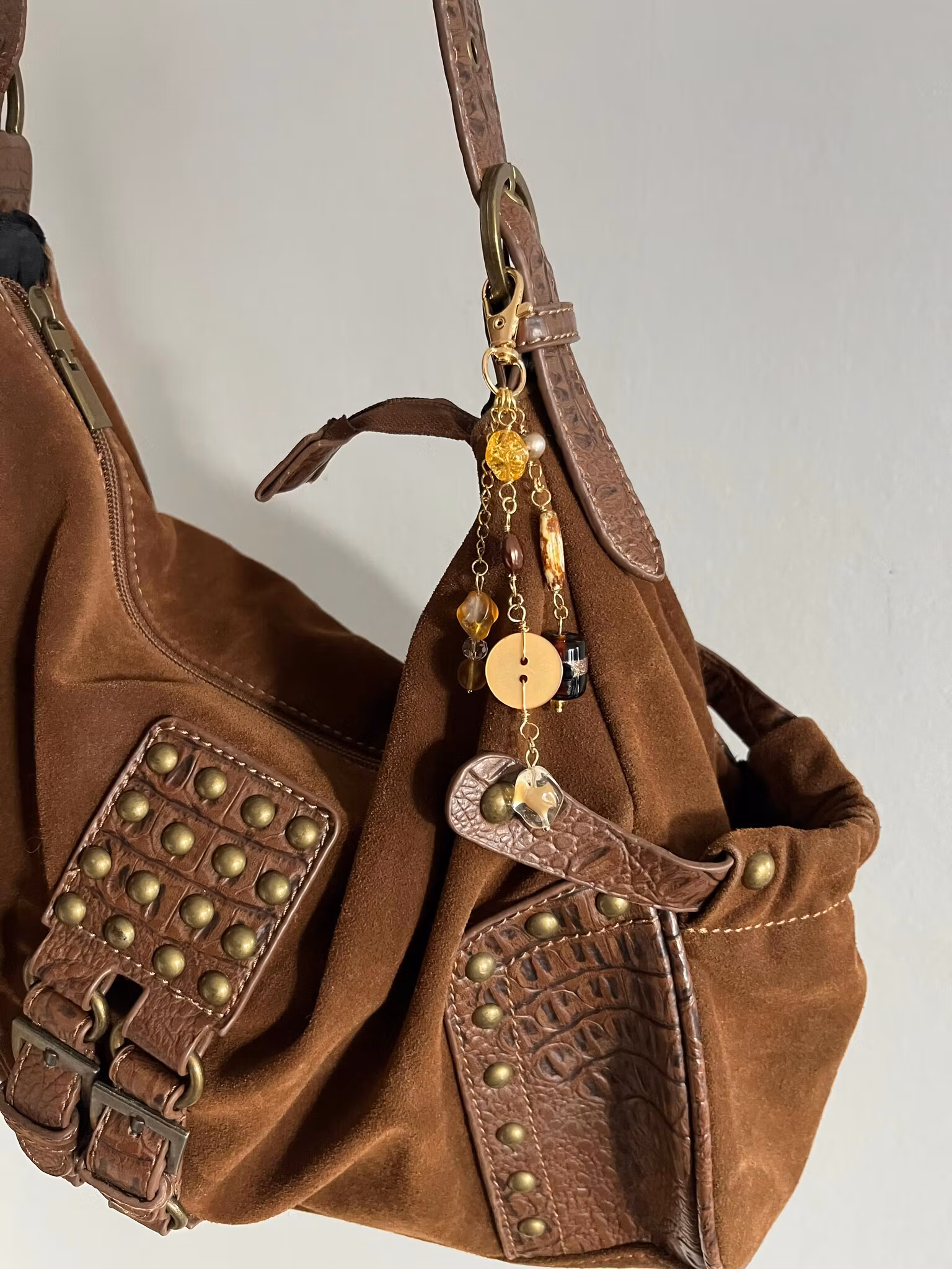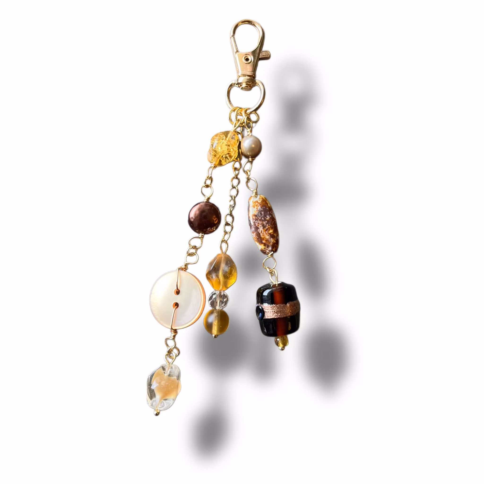 Handgjord charm som passar perfekt till att utsmycka din väska, nyckelknippa eller vad fantasin kan komma på. Charmen är gjord utav diverse återbrukade glaspärlor, sötvattenspärlor, knappar, charms.