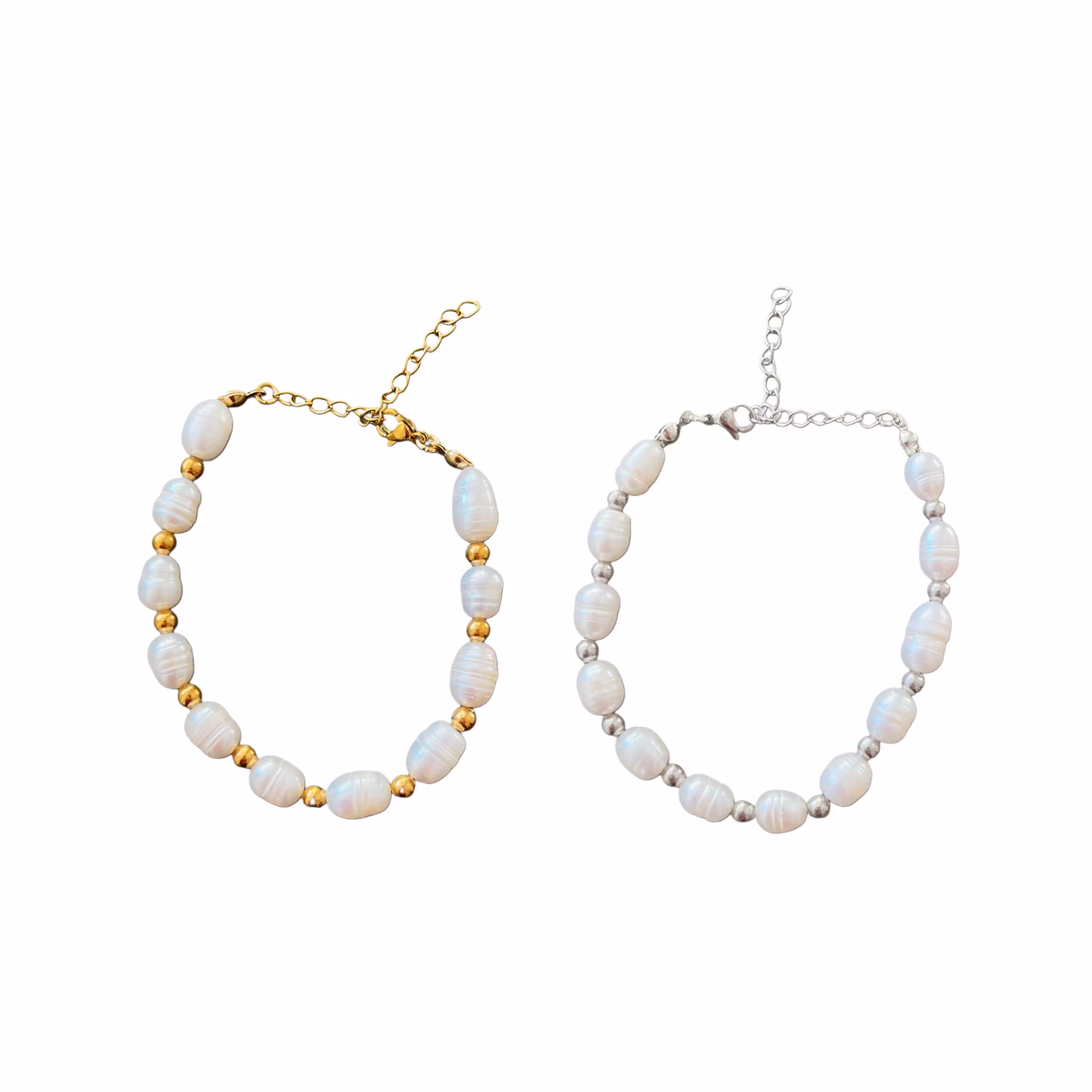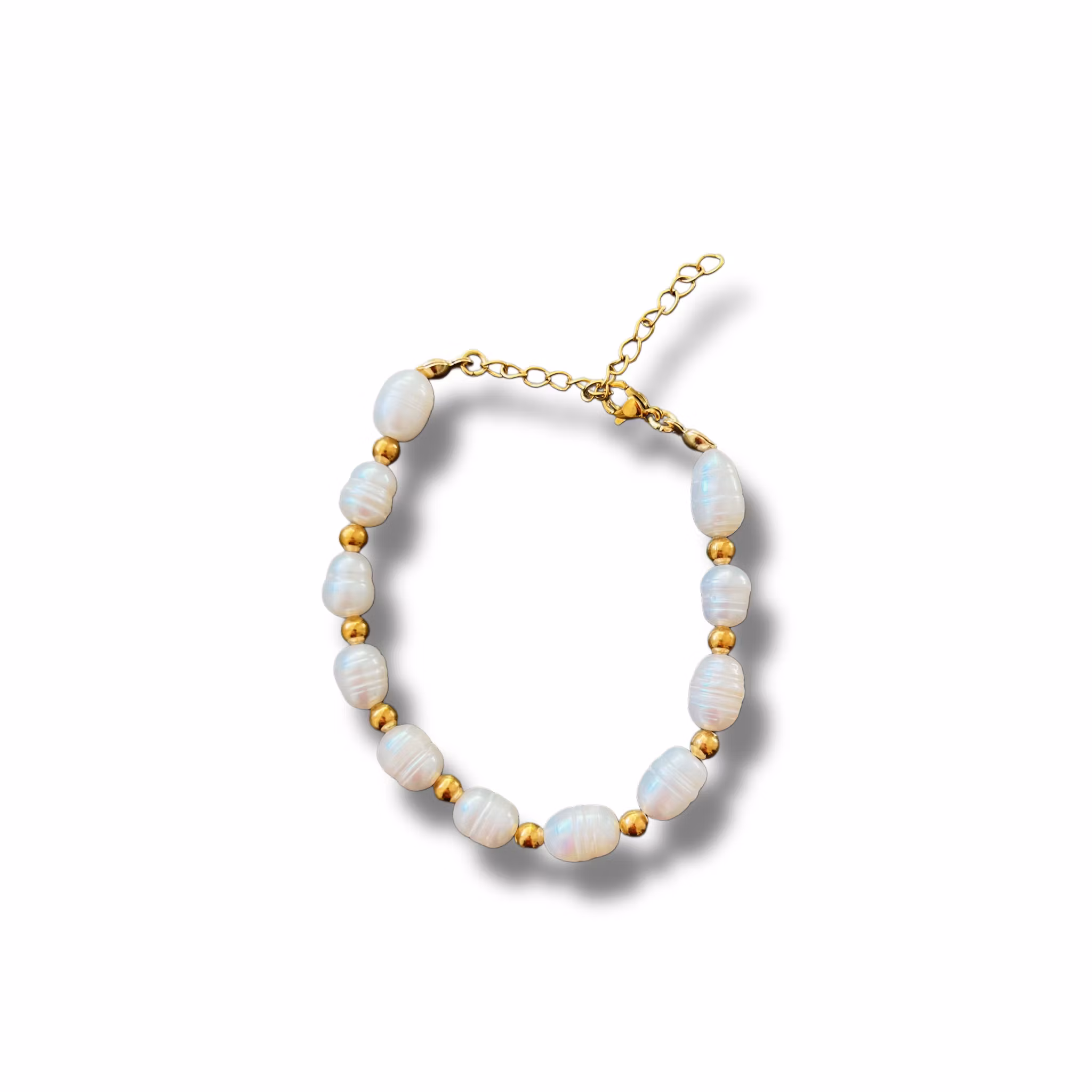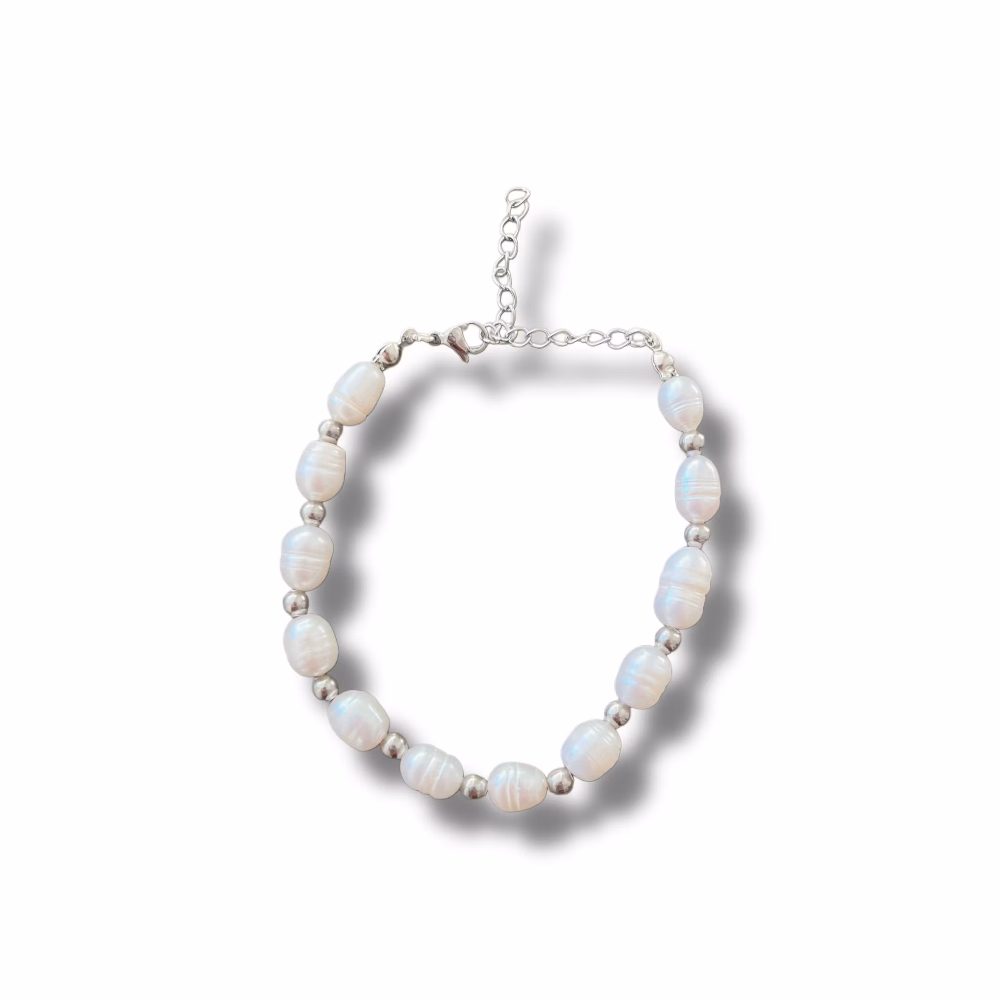 Handgjorda armband inspirerade av ostronets pärlemor vilket alla pärlor föds ur. Armbandet består av sötvattenspärlor och metallpärlor i rostfritt stål. Sötvattenspärlor är unika av natur så det kan förekomma olikheter i nyans/form/storlek. Armbandet är justerbart och blir ca 15-20cm i omkrets.
