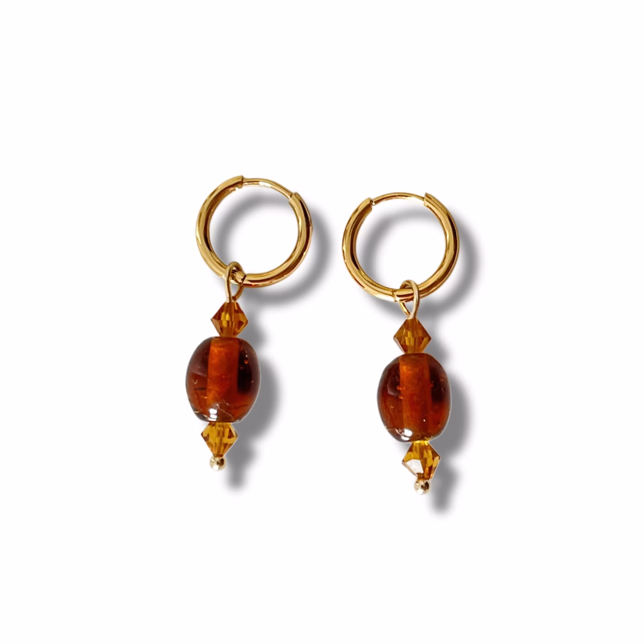 Handgjorda örhängen utav återbrukade bruna glaspärlor och återbrukade bicone pärlor. Creolerna är gjorda utav rostfritt stål och är nickelsäkra. Varje produkt från ÅTERBRUK kollektionen är unik och det finns bara 1-2 exemplar utav varje smycke.