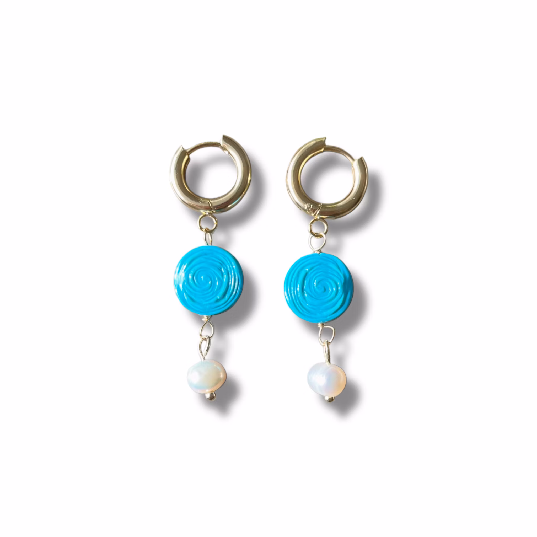 Handgjorda örhängen med turkosblåa pärlor och sötvattenspärlor. Creolerna är gjorda utav rostfritt stål och är nickelsäkra. Varje produkt från ÅTERBRUK kollektionen är unik och det finns bara 1-2 exemplar utav varje smycke.
