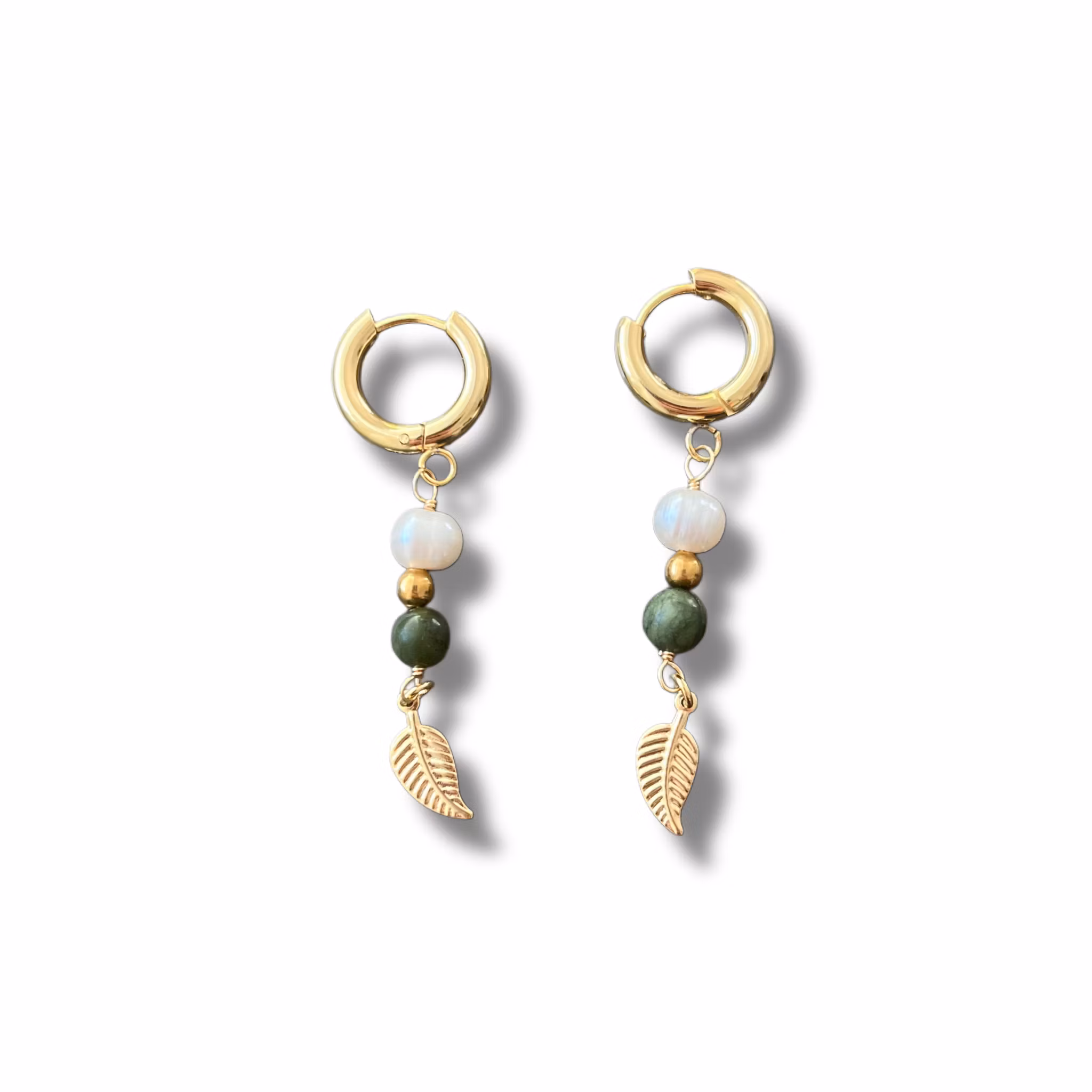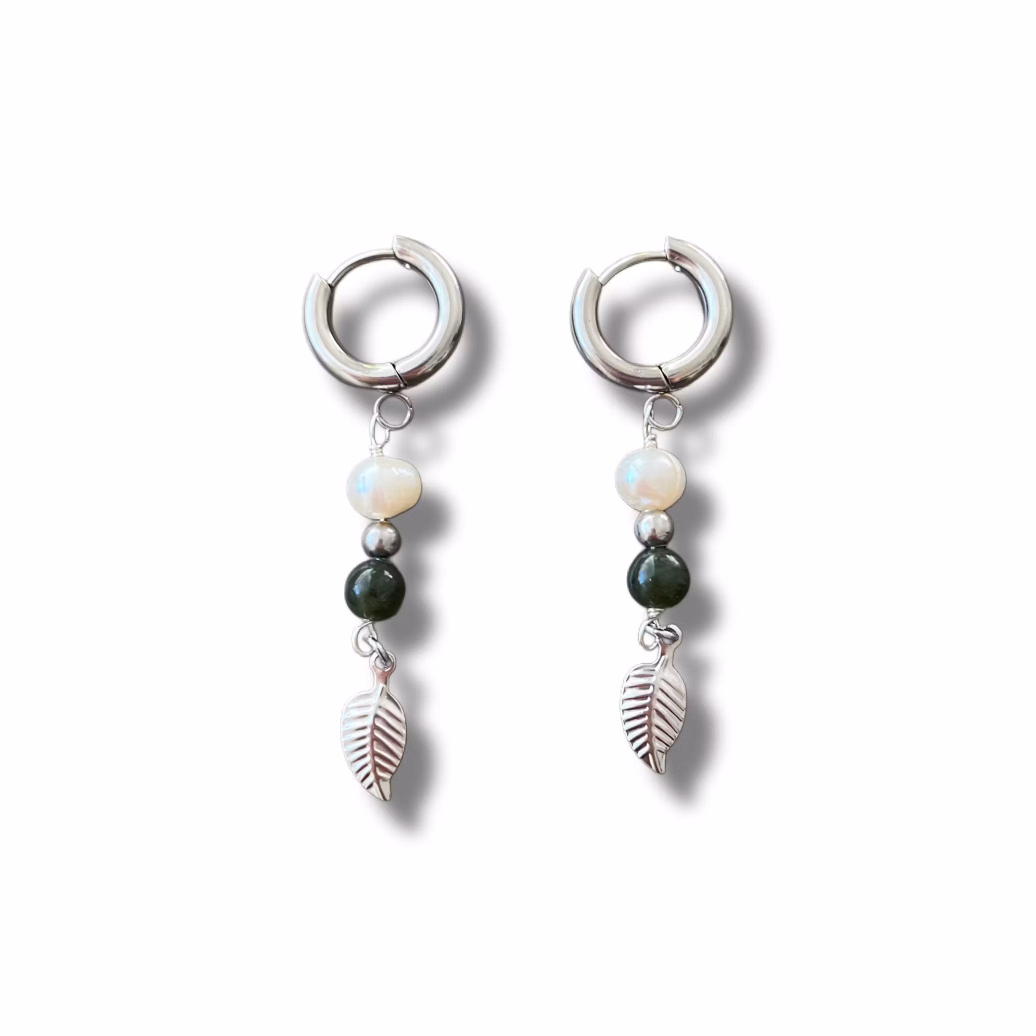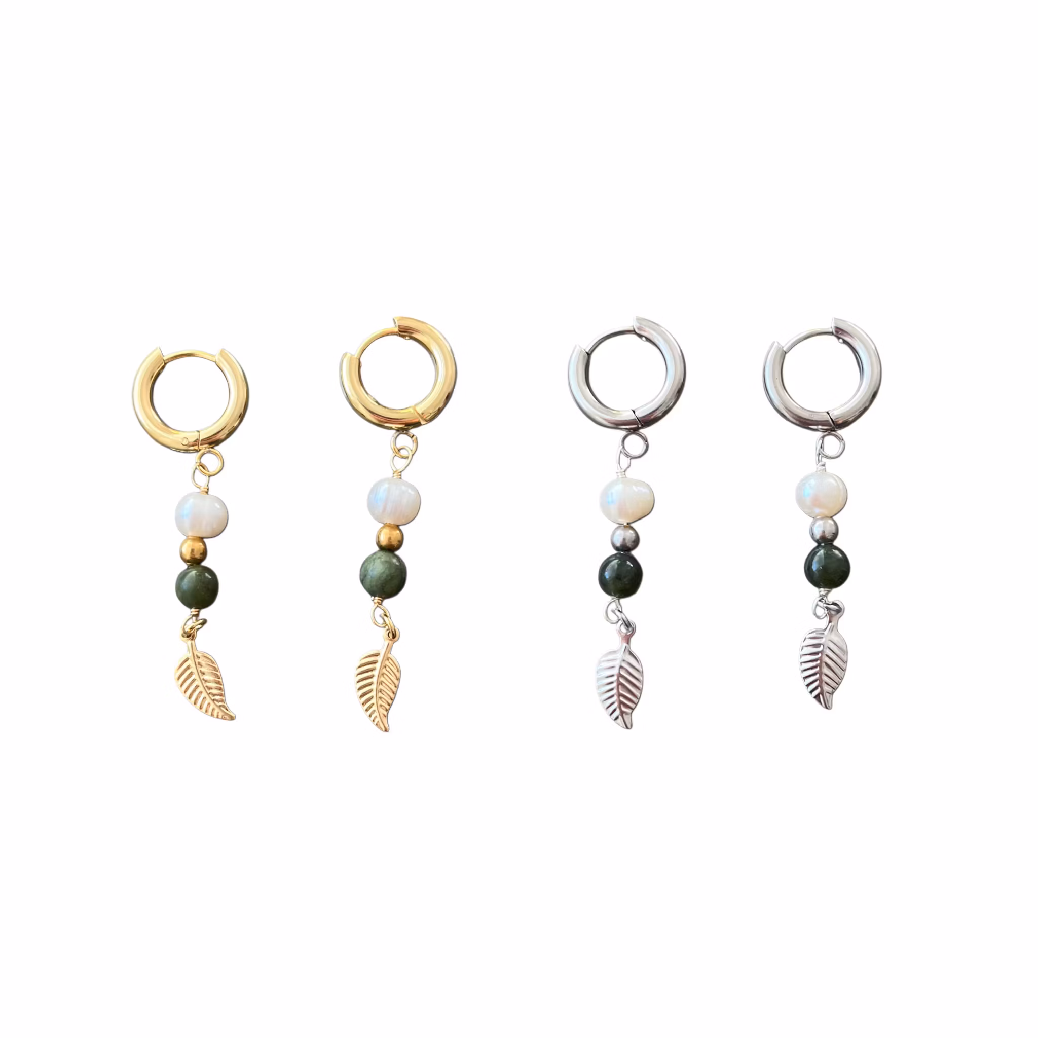 Handgjorda örhängen inspirerat av de vackra gröna nyanserna löv har innan de gulnar och faller av träden. Består av återbrukade sötvattenspärlor, metallpärlor och jadepärlor. Creolerna och löv-berlockerna är gjorda utav rostfritt stål.