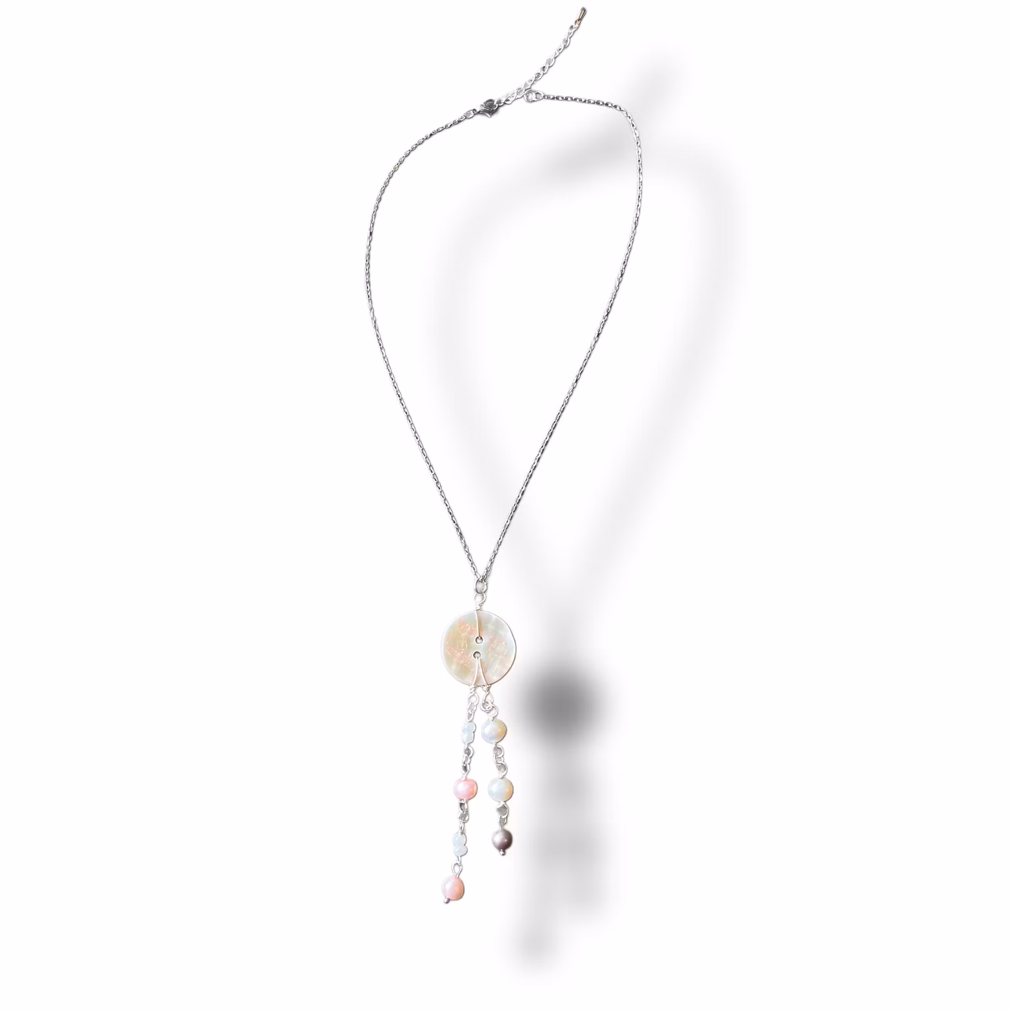 Handgjort halsband utav blandade återbrukade pärlor med en kedja utav rostfritt stål.