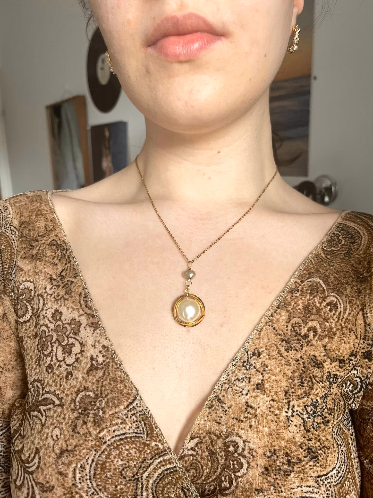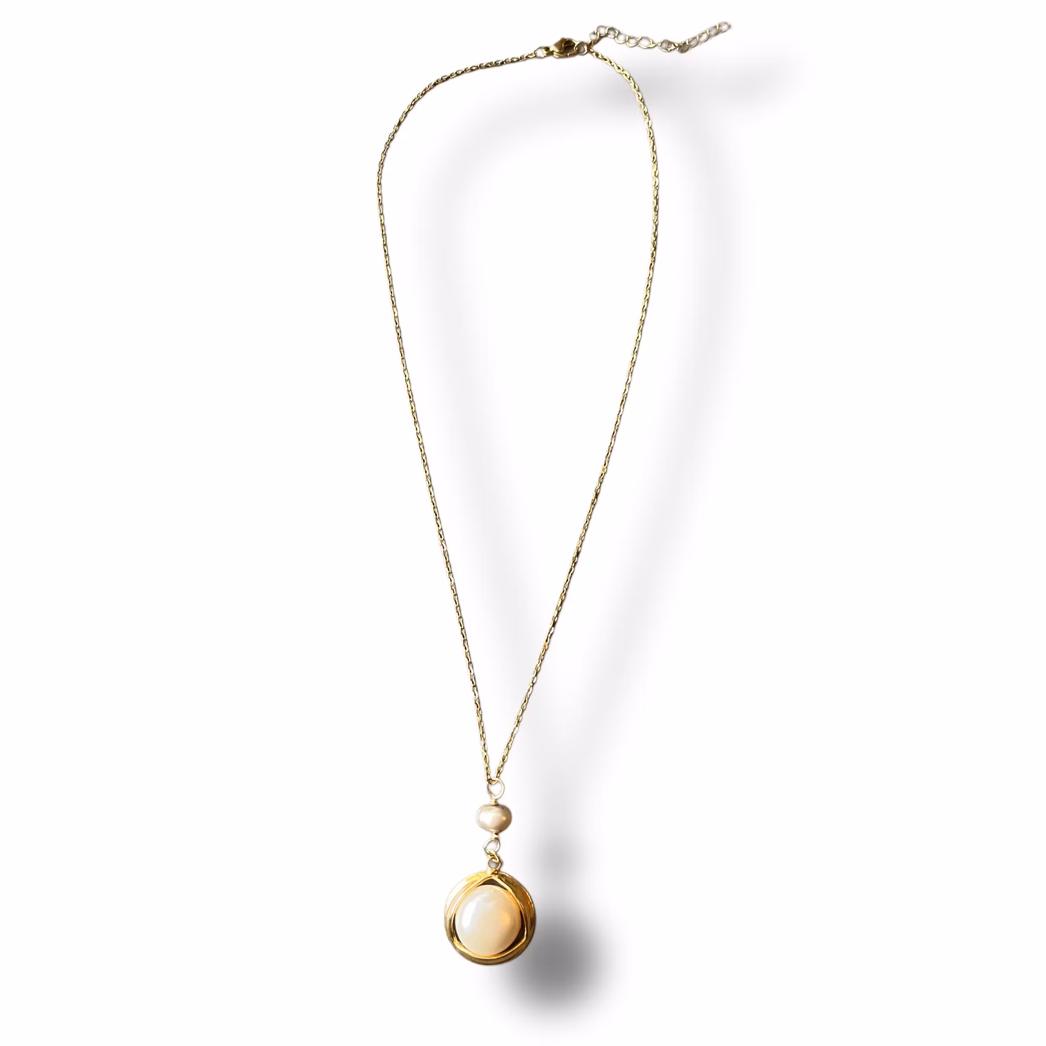 Handgjort halsband utav återbrukad berlock och sötvattenspärla. Kedjan är utav rostfrittstål.