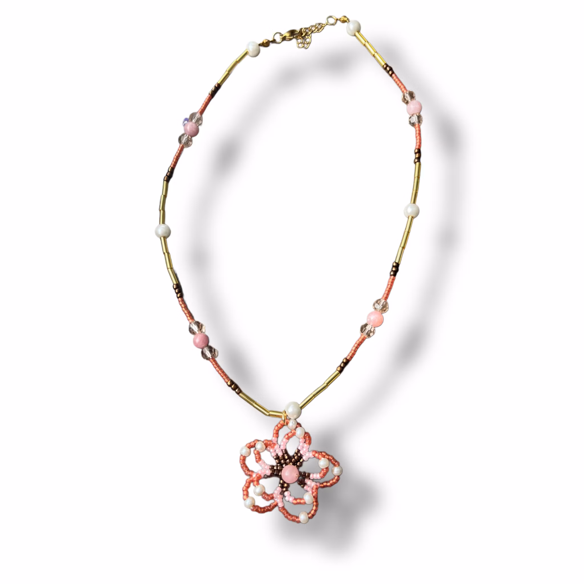 Handgjort pärlhalsband med blomma. Blomman är handgjord utan Miyuki pärlor och guldig metalltråd. Halsbandet är gjort av olika sorts pärlor och nylontråd.