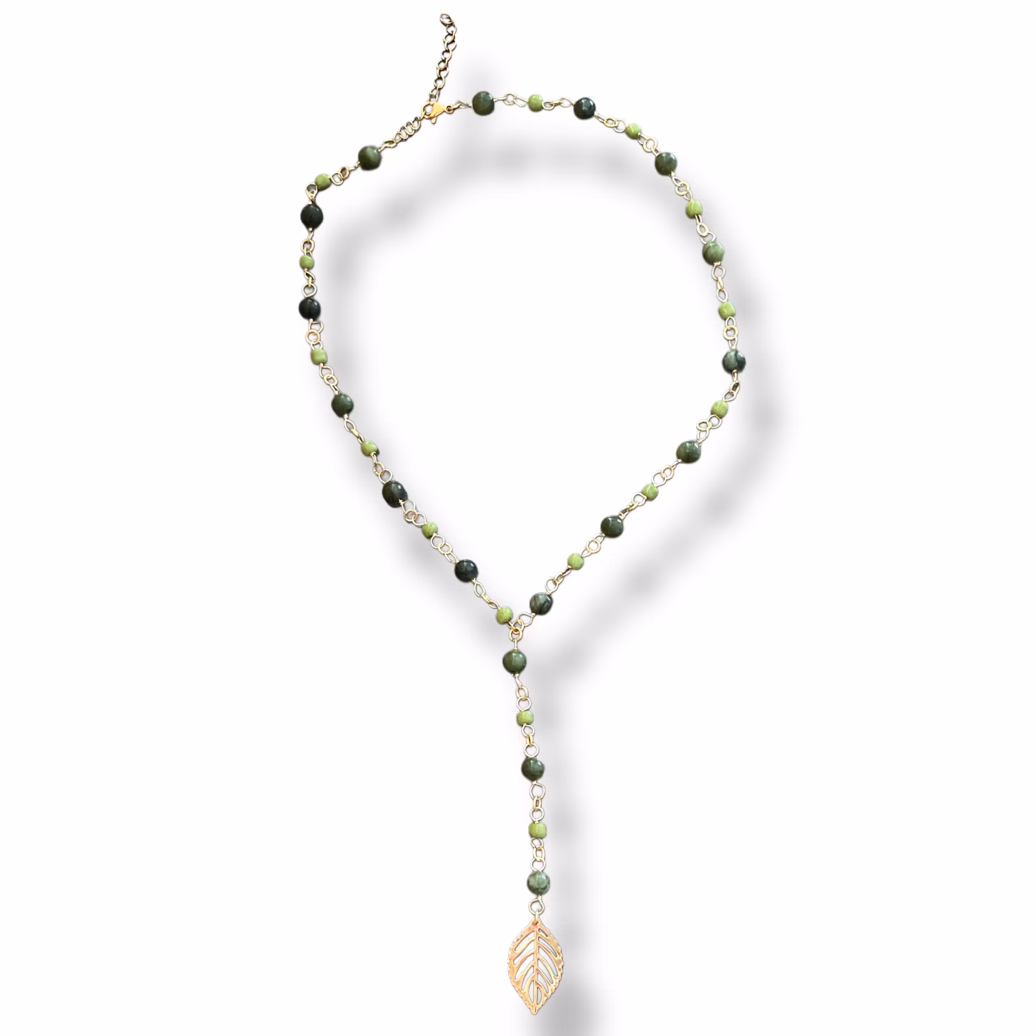 Handgjort halsband inspirerat av de gröna krusbären. Superfint och unikt med ett löv hänge. Halsbanden är tillverkade utav gröna Jade pärlor, seed beads och en löv berlock utav rostfritt stål. Går att justera i längden. Halsbandet blir ca 38-43cm i omkrets.
