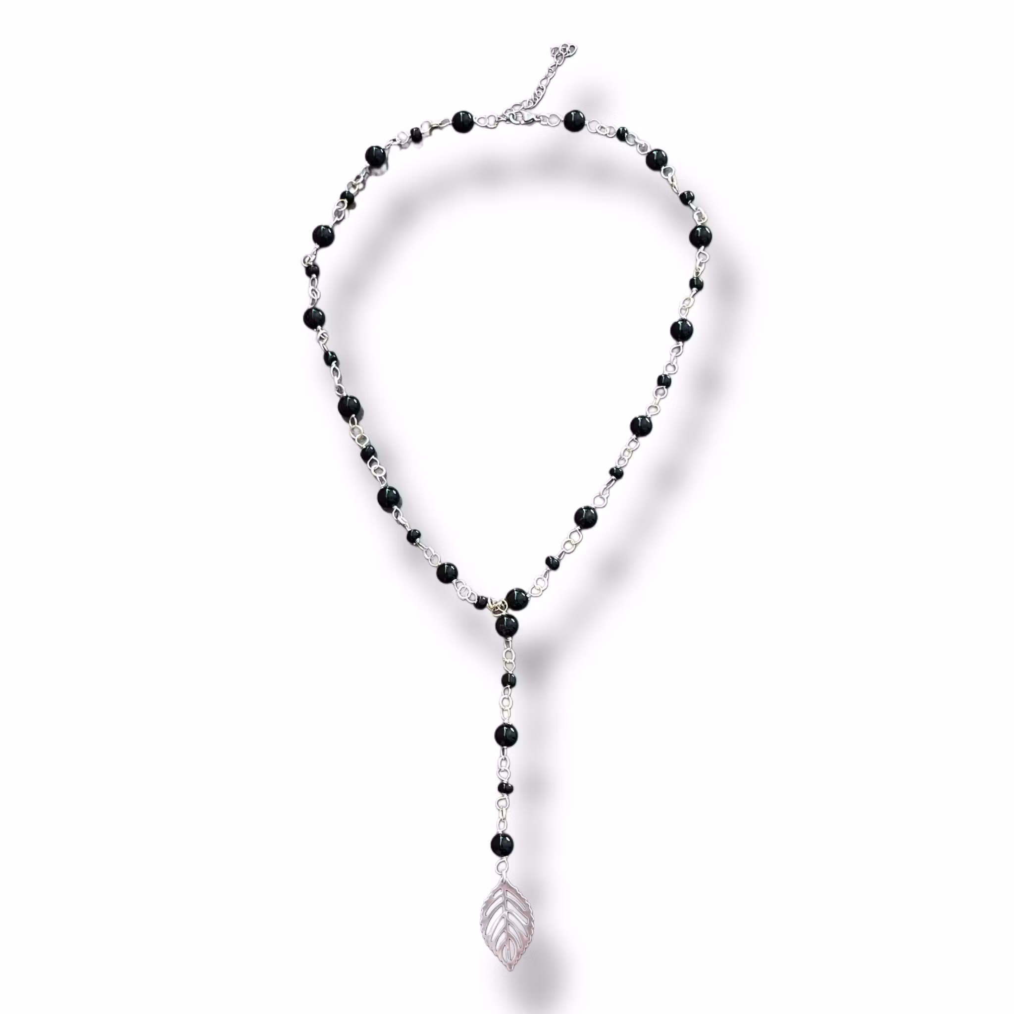 Handgjort halsband inspirerat av svarta vinbär. Superfint och unikt med ett löv hänge. Halsbanden är tillverkade utav onyx pärlor, seed beads och en löv berlock utav rostfritt stål. Går att justera i längden. Halsbandet blir ca 38-43cm i omkrets.